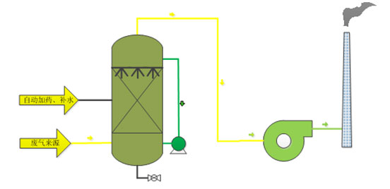 在車(chē)間將無(wú)組織排放的廢氣首先經(jīng)過(guò)收集罩收集后,廢氣經(jīng)過(guò)引風(fēng)機(jī)作用下,引入含酸(堿)的洗滌塔吸收中和,使含酸(堿)廢氣中和后達(dá)標(biāo)排放。