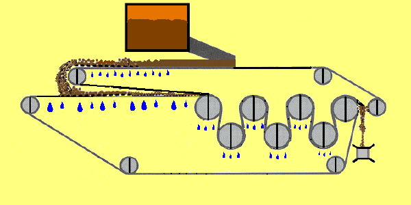 順利進入擠壓脫水區(qū),進入“ S ”壓榨段,在“ S ”型壓榨段中,污泥被夾在上、下兩層濾布中間,經(jīng)若干個壓榨輥反復(fù)壓榨,上下兩條濾帶在經(jīng)過交錯各輥形成的波形路徑時, 由于兩條濾帶的上下位置順序交替,對夾持的泥餅產(chǎn)生剪切力, 將殘存于污泥中的水分絕大部分積壓濾除,促使泥餅再一次脫水,后通過刮刀將干泥餅刮落,由皮帶輸送機或無軸螺旋輸送機運至污泥存放處。